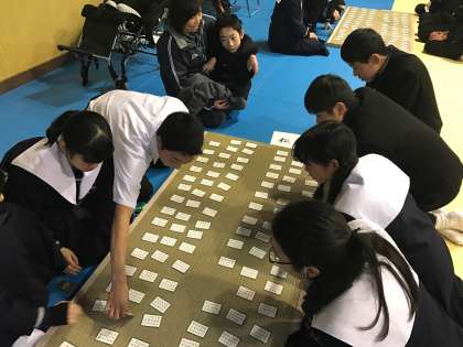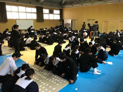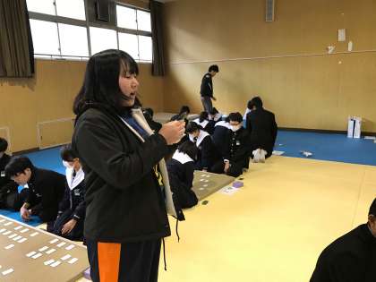 本日5・6時間目に、2年生は百人一首大会を行いました。試合は70首を教員が分担して詠み、3回戦まで行い取り札の合計数で勝敗を決しました。