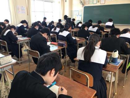写真は2−3の家庭科、2−2の数学、3−3の国語の授業の様子です。