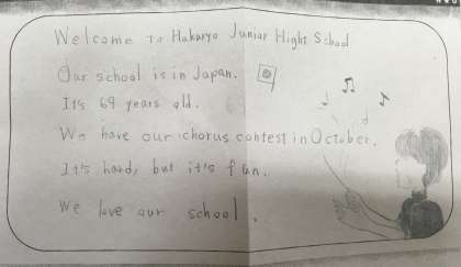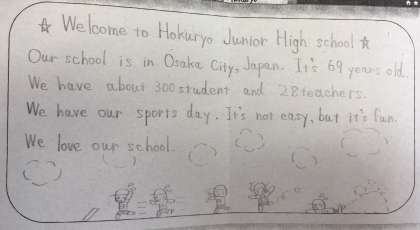 1年生の英語の授業で、学校のWebページにある学校紹介を一人ひとりが英語で書きました。学習した表現を上手に使いながら、学校行事や学校に関するいろいろな数値を英語で作文しました。