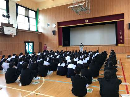 本日は4時間授業でした。全学年、学活、学級写真撮影、学年集会を行いました。写真は3年生の学年集会でのようすです。