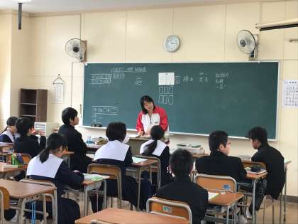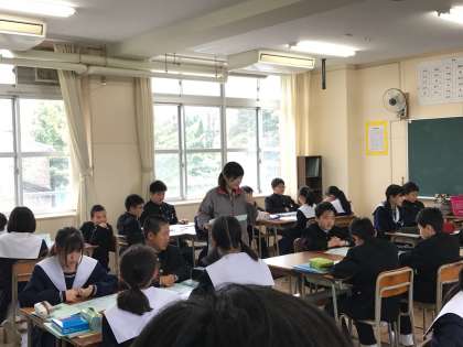 1年生の授業のようすです。小谷先生と阪本先生による英語科の授業と、横井先生による家庭科(少人数分割)の授業です。