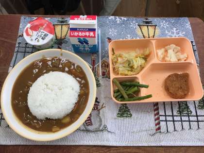 本日は新学期の昼食2日目です。デリバリー給食のメインはカツカレーライスでした。