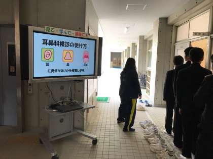 本日午前中、全学年で耳鼻科検診を行いました。耳、鼻、のどのようすを診ていただきました。