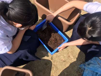 ミニトマトの栽培を行います。プランターの土入れの様子です。育てるにあたっての始めの準備を行いました。