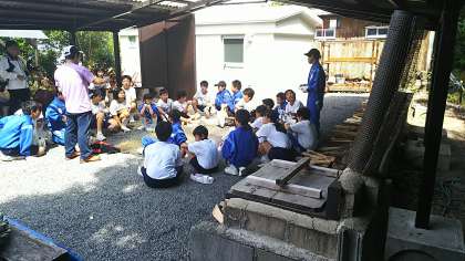 各班の薪の係りが、薪に火をつける方法の説明を聞いています。