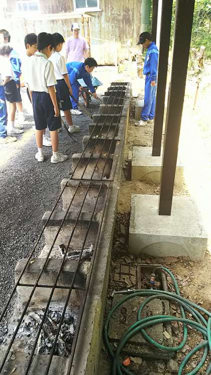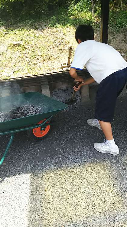 燃えた後の炭が沢山ありますので、スコップと一輪車で回収作業をしています。