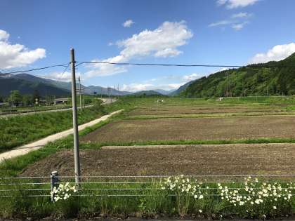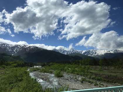 峰にはなお雪が残っています。後しばらくで栂池高原に到着する予定です。