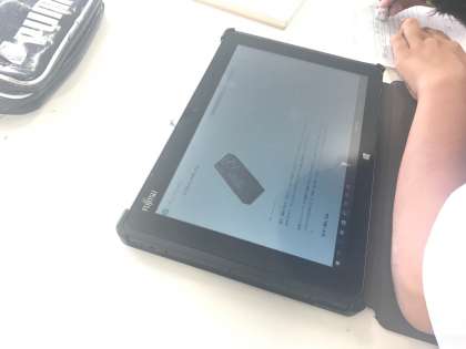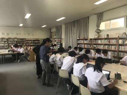 1年生の国語科では、図書室の本とタブレット端末を使っての調べ学習を行っています。