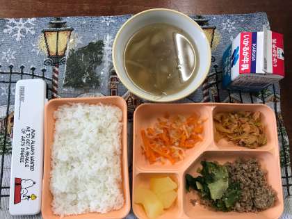 ビビンバ、ツナとキムチの炒めもの、りんご缶詰、豆腐のスープ