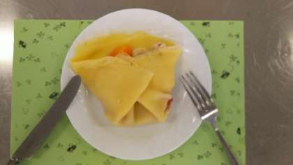 先週に続きまして、一昨日の月曜日にも「北稜元気アップ学校支援ボランティア」の皆さまに準備・実習補助をしていただき、3年2組B班での家庭科調理実習を行いました。美味しそうなクレープの出来上がり!
