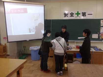 カラクリ人形の専門家でもある技術科の畠野教諭が作品について紹介しています。