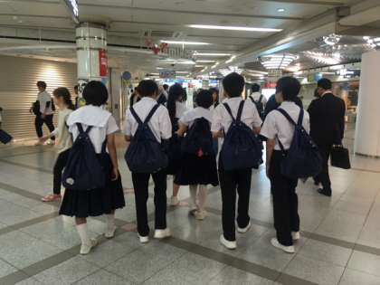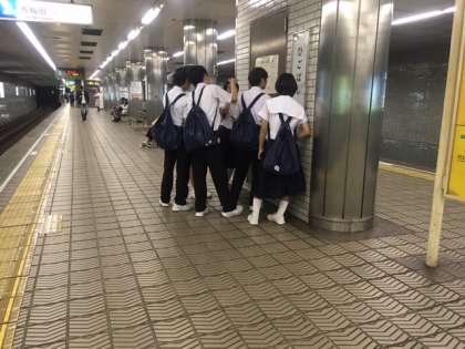 谷町線からの乗り換えのために梅田地下街を移動している様子と、肥後橋駅に到着した様子です。