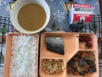 さごしの塩焼き、鶏肉と野菜の煮もの、れんこんのきんぴら、さくらんぼ、みそ汁