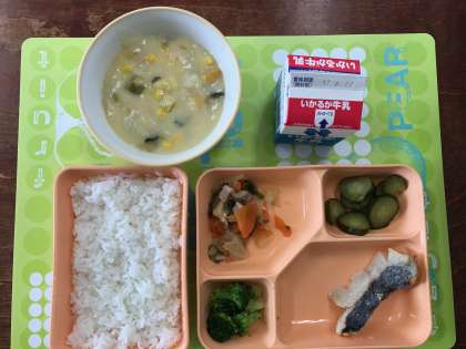 今日の献立は、かぼちゃのクリームシチュー、ブロッコリー、白身魚のムニエル、ベーコンと野菜のソテー、きゅうりのピクルス です。