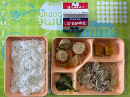 今日の献立は、豚肉のしょうがじょうゆ炒め、一口がんもと野菜の煮もの、焼きかぼちゃの甘みつかけ、ほうれん草とはくさいのおひたし です。