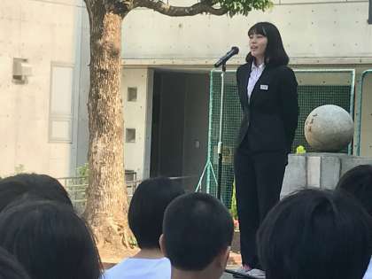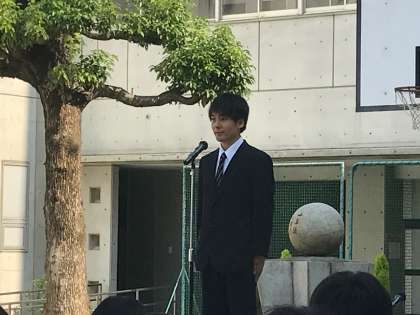 本日、3週間にわたって本校で教育実習を行なった3名の本校卒業生が実習最終日を迎えました。実習終了にあたり、本日の全校朝礼においてご挨拶がありました。