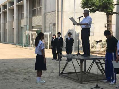 さる6月19日(日)に行われた「阿倍野高校杯」において、女子テニス部が女子シングルスの部で準優勝しました。本日の全校朝礼で、伝達表彰しました。