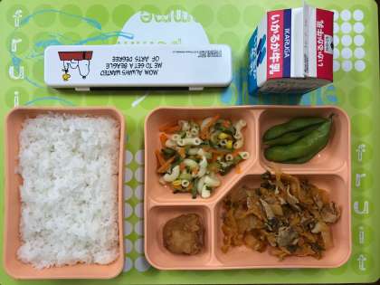 今日の献立は、豚キムチ、マカロニサラダ、枝豆、鶏肉のから揚げ です。