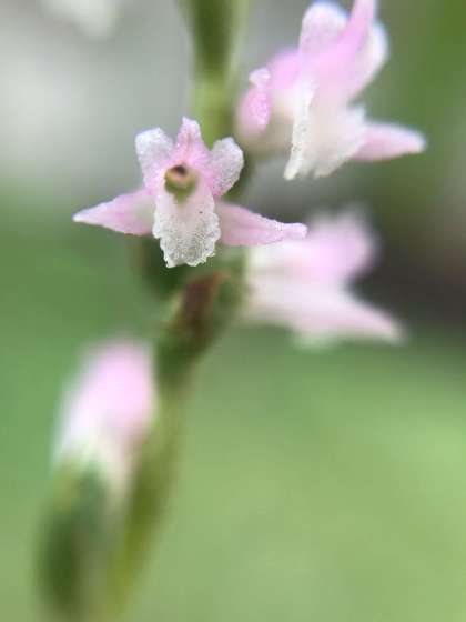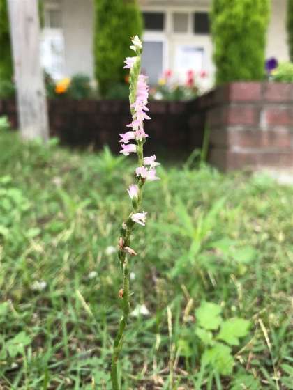 本校、事務室前の桜の樹の下に、小さな野草の花が咲いています。ラン科の「ネジバナ」というこの植物は、小さな花をネジのように螺旋を描いてつけています。一つ一つの花は立派にラン特有の形をしています。