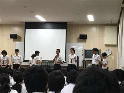 写真右は、保健委員と学級委員長によるロールプレイの様子です。先輩に違法薬物を勧められたという状況を想定し、即興で断り方を考えました。「そんなもんでテストの点数が上がるなら、苦労してません」とか「もうサプリは十分です」などと、みんなウィットに富んだ立派な断り方をしていました。