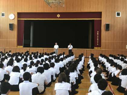 終業式に先立って、天満警察署の方より、夏休みを迎えるにあたって、中学生が犯罪被害に遭わないためのお話をしていただきました。