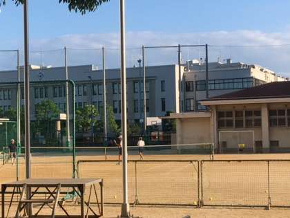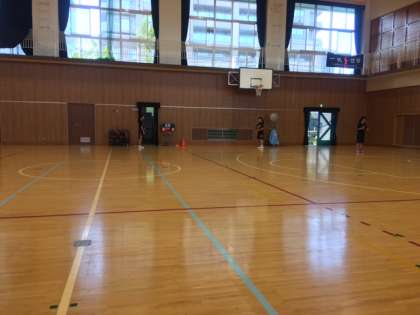 体育館では女子バスケットボール部、グラウンドでは女子テニス部が活動していました。
