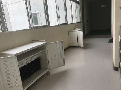 二階に設置しているタブレット端末保管台を二つともエレベーターに載せて、教室前の廊下まで移動しています。