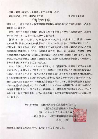 今年1月にご協力お願い致しました「書き損じハガキ」等の回収においてご寄付頂きました書き損じハガキ等について、大阪市視覚障害者福祉協会よりお礼状が届きました。