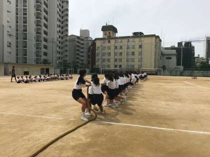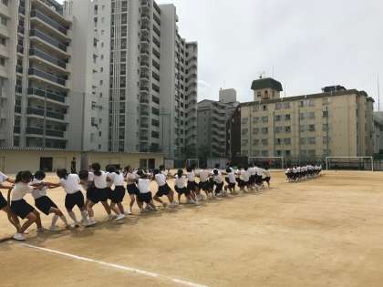 本日の1年生体育の授業では、入場行進の練習や、綱引きの模擬戦をしていました。