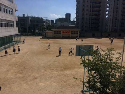 本日昼休みのグラウンドの様子です。晴れた空の下、真夏に近い気温に上がっていますが、みんな元気です。