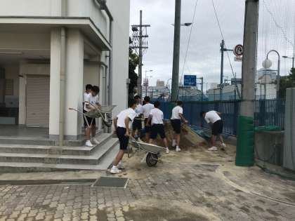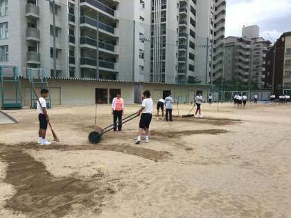 今朝の激しい雨でグラウンド状態が悪いのですが、有志で残ってくれた生徒たちが補修をしてくれました。
