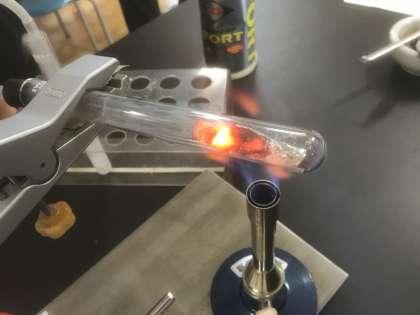 銅の還元実験です。熱と光を放ちながら反応して、金属の銅ができました。