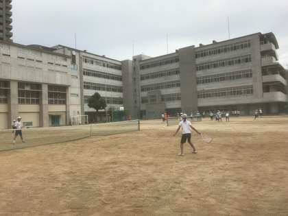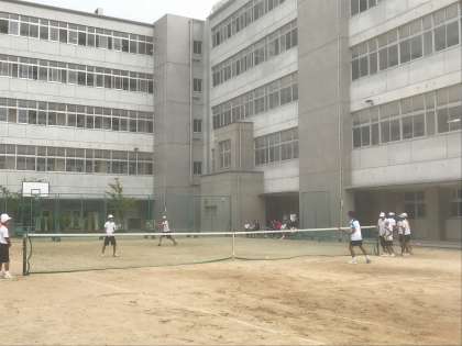 小学生のみなさんにも、中学生と一緒にコート設営から行い、簡単にウォーミングアップを行い、小学生と中学生のラリーを経て、ダブルスでのゲームを行いました。中学生が翻弄される場面も多々あり、楽しい試合になりました。