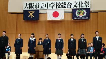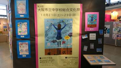 10/21(土)に大阪市中学校総合文化祭開会式が鶴見区民センターでありました。そこで、各教科優秀作品の表彰式があり、総合文化祭ポスターコンクールの部で入賞した美術部2年が代表で表彰状を授与されました。入賞した作品が今年の総合文化祭のポスターになって