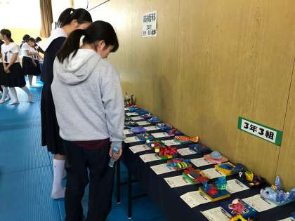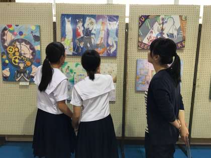 格技室において、美術科の授業での作品を展示見学している様子です。