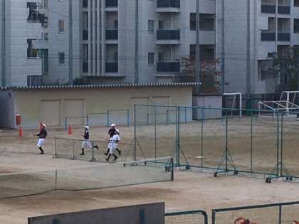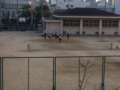 グラウンドでは、女子テニス部、サッカー部、野球部が練習しています。