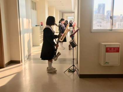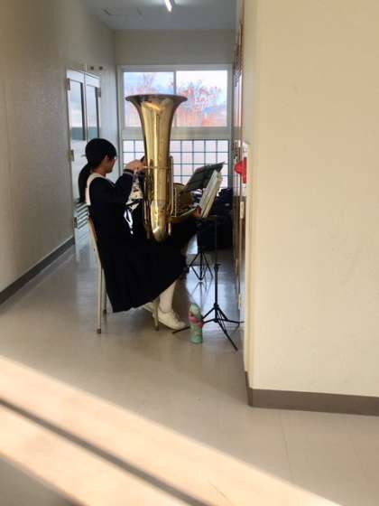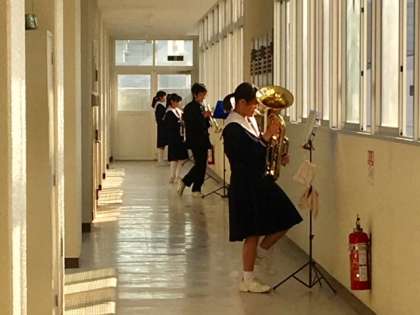 吹奏楽部が廊下で練習しています。