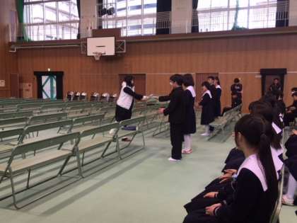 2年生は朝の学年集会で、学校元気アップ図書ボランティアの皆さまによる、図書の貸し出し数上位生徒の表彰状伝達授与を行いました。