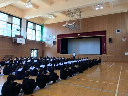 写真は、1年生の学年集会の様子です。仮の学級委員長が主体となって、集会時の並び方の確認などをしました。