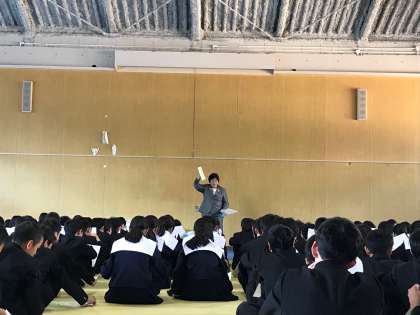 本日3時間目、1年生は、学級写真撮影の後、格技室において、倉田先生から、部活動についての説明をしていただきました。