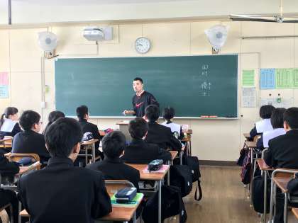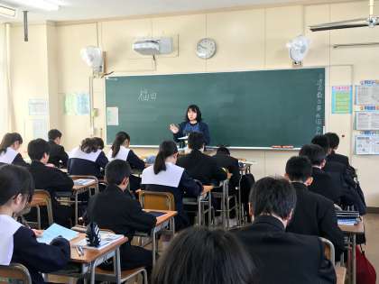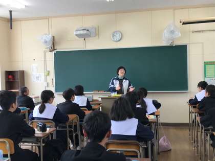写真は1年生の授業の様子です。中学校での初めての授業は、1組が数学、2組が国語、3組が英語です。