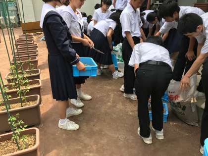 2年生の技術科では、トマトの苗を植え付けました。
