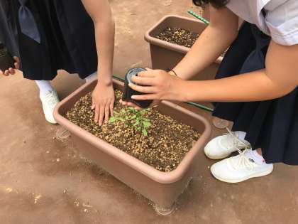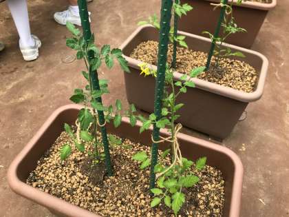 用土を入れたら苗を植え付け、支柱を立てて誘引します。