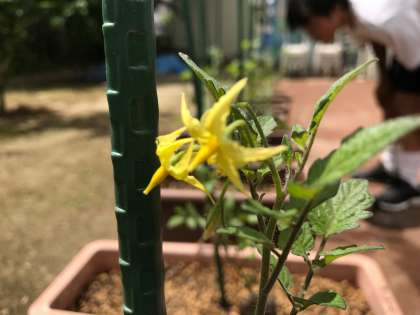技術で植えたトマトに水やりをしました。トマトの花は黄色です。
