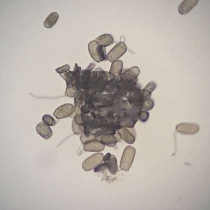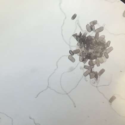花粉を砂糖水に落とすと、花粉管が伸びてきました。15分後と105分後の花粉管の写真です。