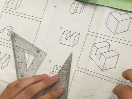製図の授業です。一人ひとりの図面を丁寧に添削しているところです。