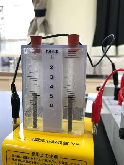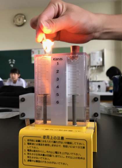 写真右は、発生した水素に着火した様子です。どの班もちゃんと音を立てて燃えました。