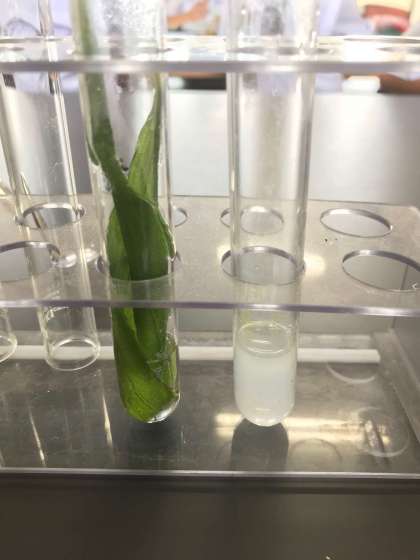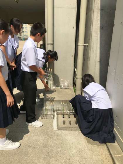 1年生理科では、植物の光合成の実験を行いました。日向に置くと、野草を入れた試験管の中の二酸化炭素は速やかに植物に吸収されました。