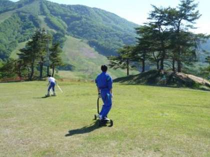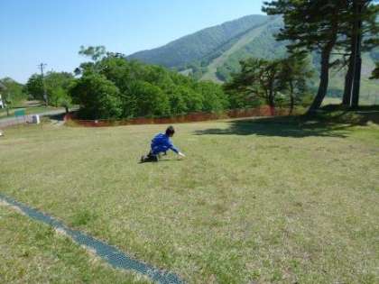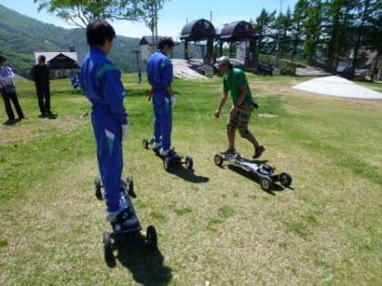 タイヤのついたマウンテンボードで、バランスをとりながら夏のゲレンデを下るのはとても難しく、体験者たちも苦労していました。