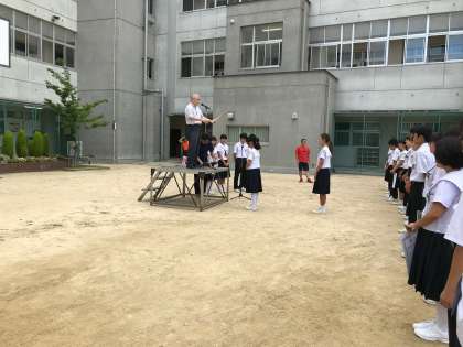 全校集会にて、先月の「遅刻0月間」優秀クラスの表彰と、昨日女子テニス部が参加した阿倍野高校杯の表彰がありました。